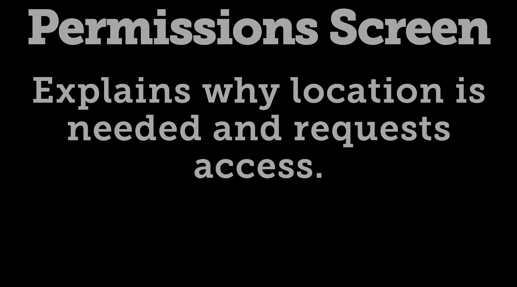 Permissions Screen Explains why location is needed and requests access.