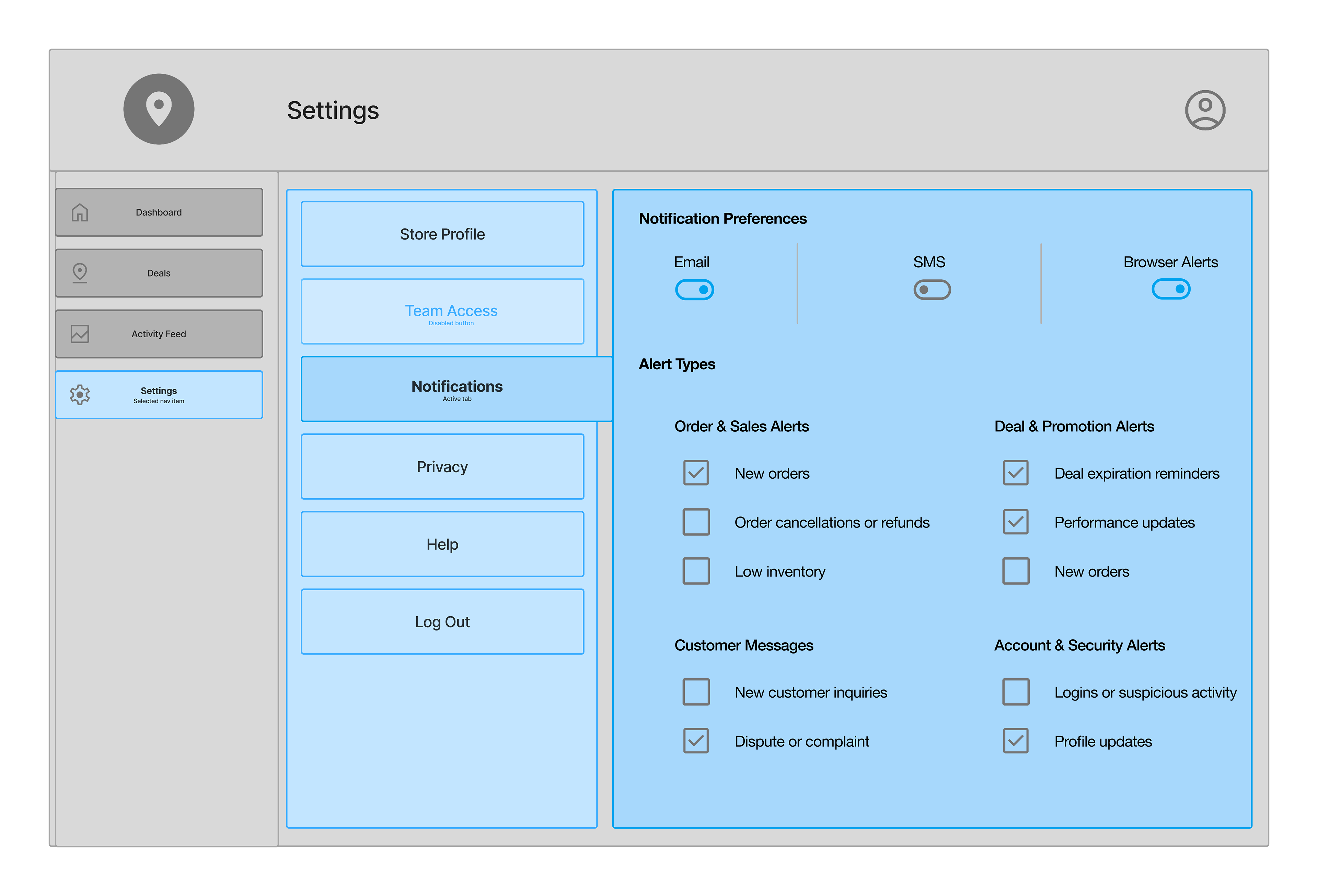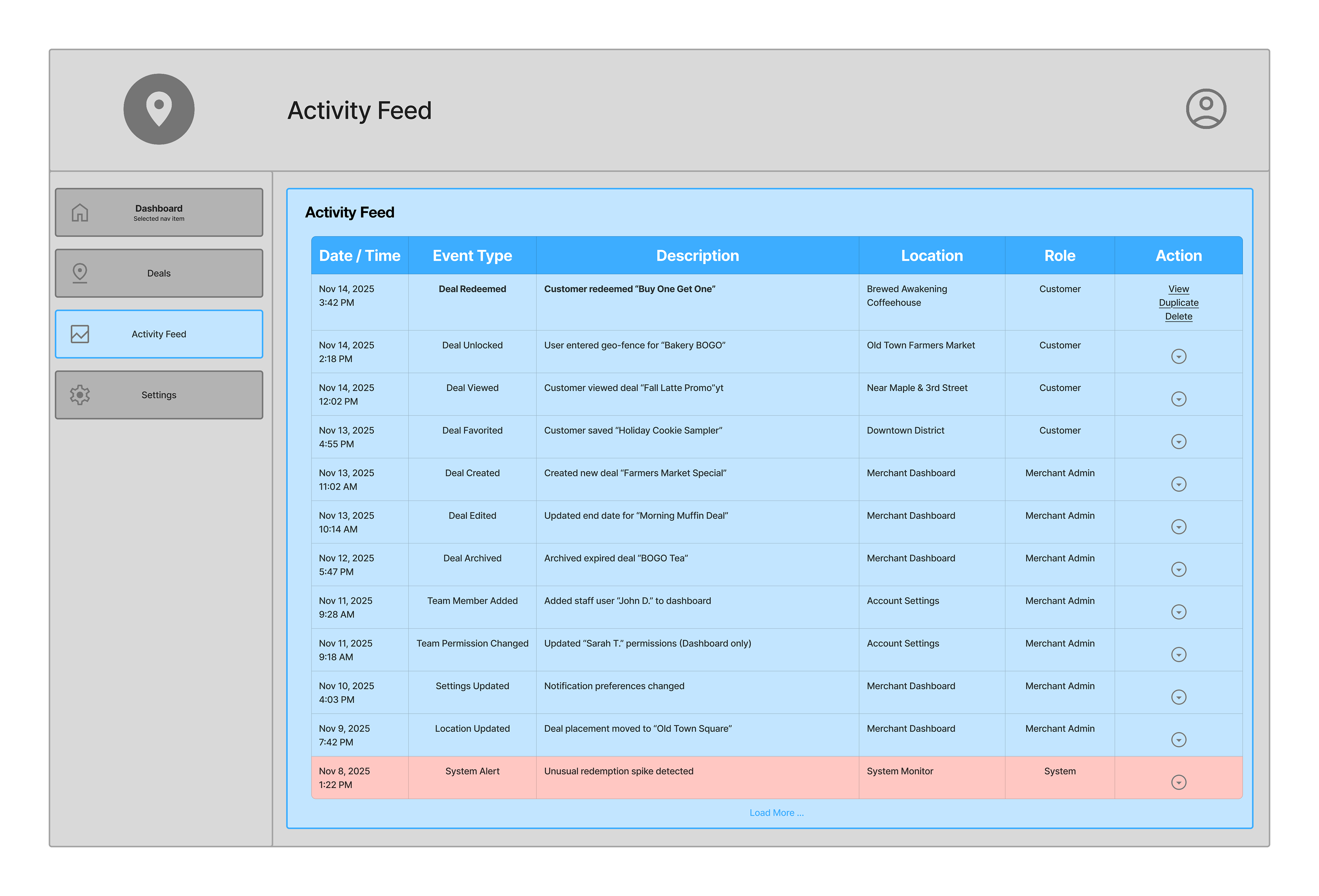 This dashboard helped me think through the merchant side of the system and what tools they’d realistically need to manage location based deals. The structure feels close to what I’d expect to use myself: clean inputs, clear activity logs, and simple performance summaries.