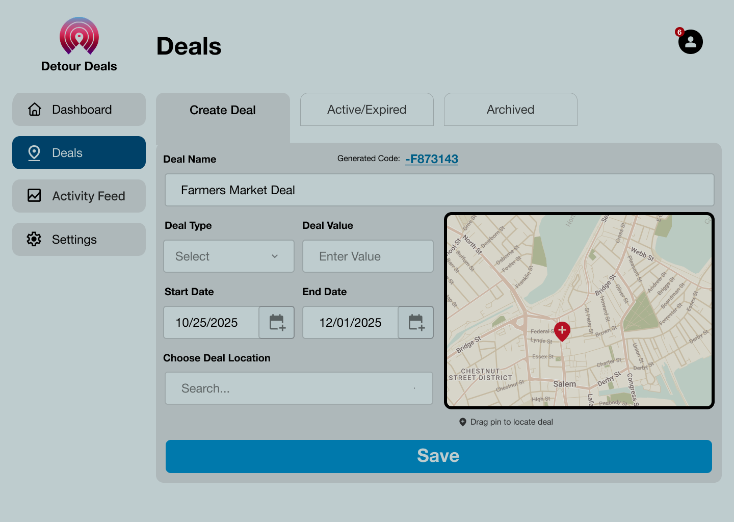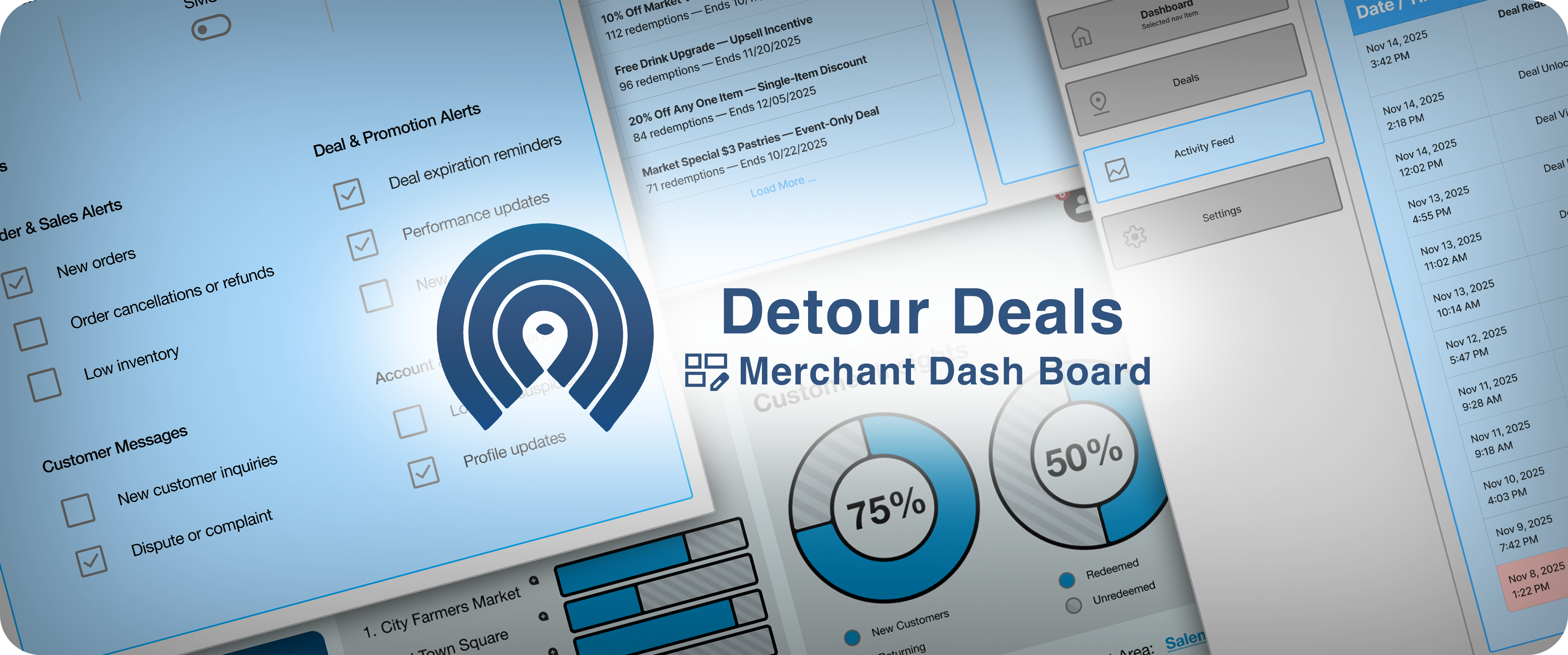 The Detour Deals Merchant Console is a web based dashboard that allows local merchants to create offers, manage deal activity, and monitor performance across real world locations. It complements the mobile app by giving merchants simple tools to place deals anywhere their customers already are.