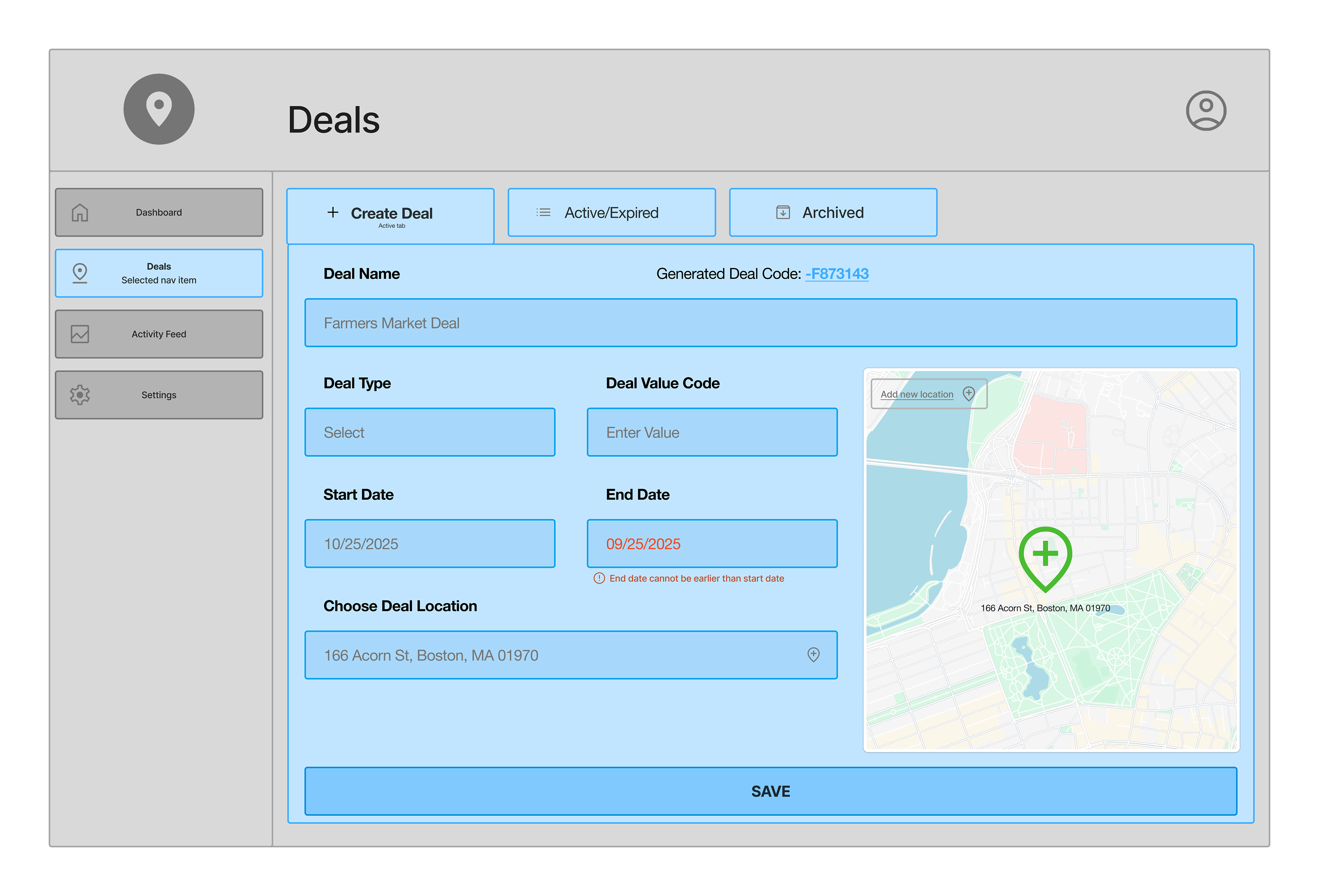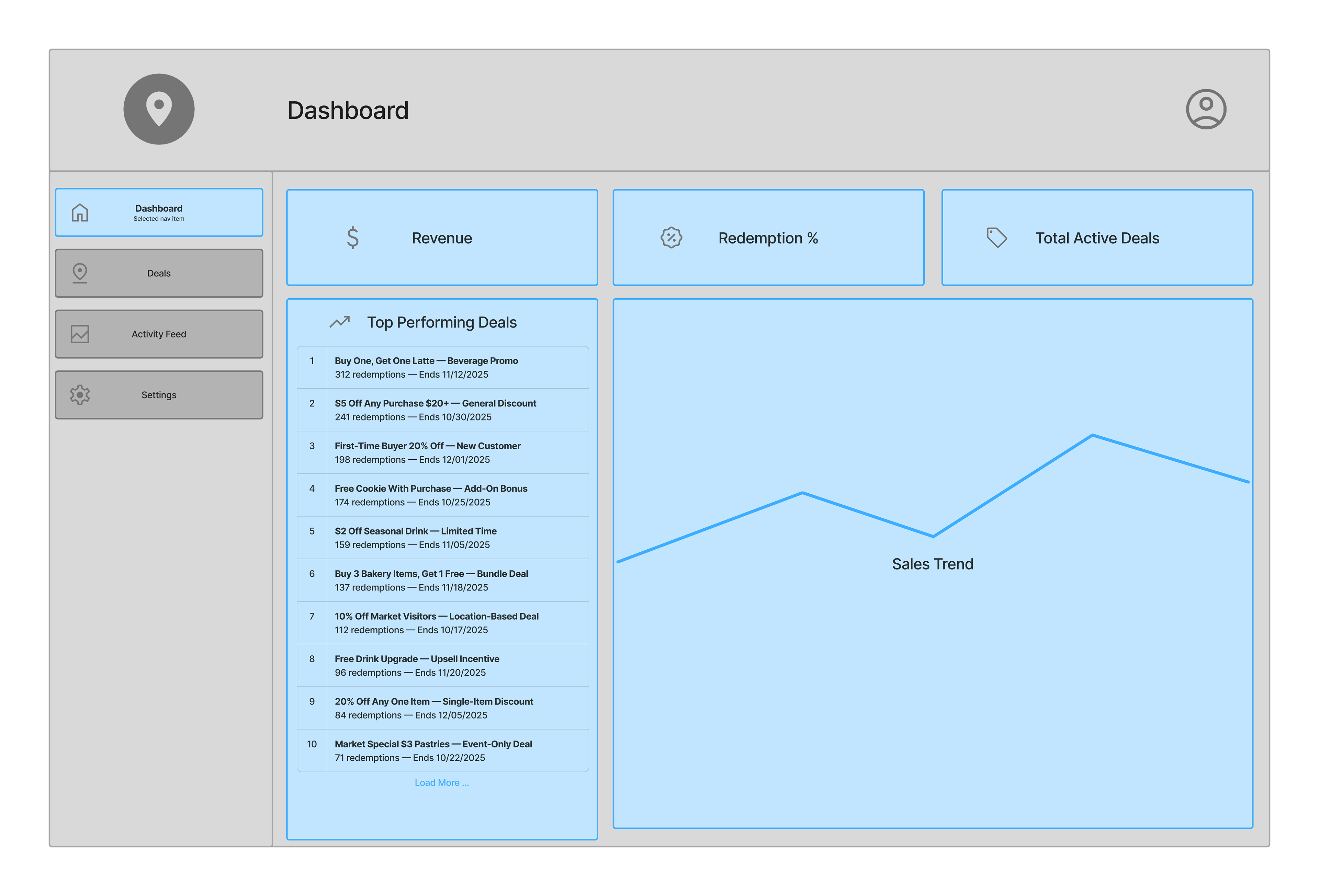 A simple, modular dashboard where merchants create location-based deals, pick where they appear, and track unlocks and redemptions. Built to support future drag-and-drop customization.